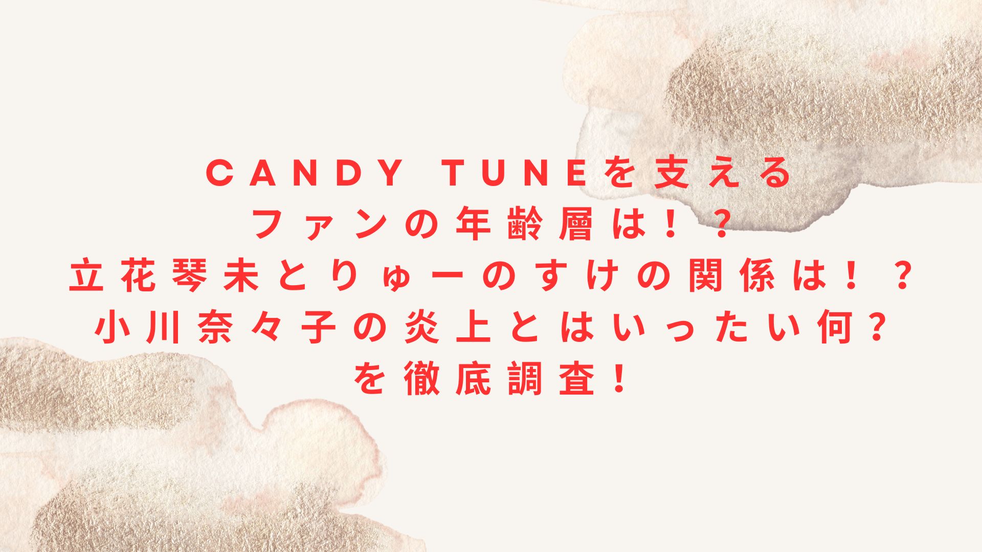 今回はCANDY TUNEを支えるファンの年齢層は!?立花琴未とりゅーのすけの関係とは!?小川奈々子の炎上とはいったい何?などを徹底調査!と題して、『CANDY TUNE』のファンの年齢層や立花琴未さんとりゅーのすけさんの関係、小川奈々子さんの炎上の理由などを調査していきます。
