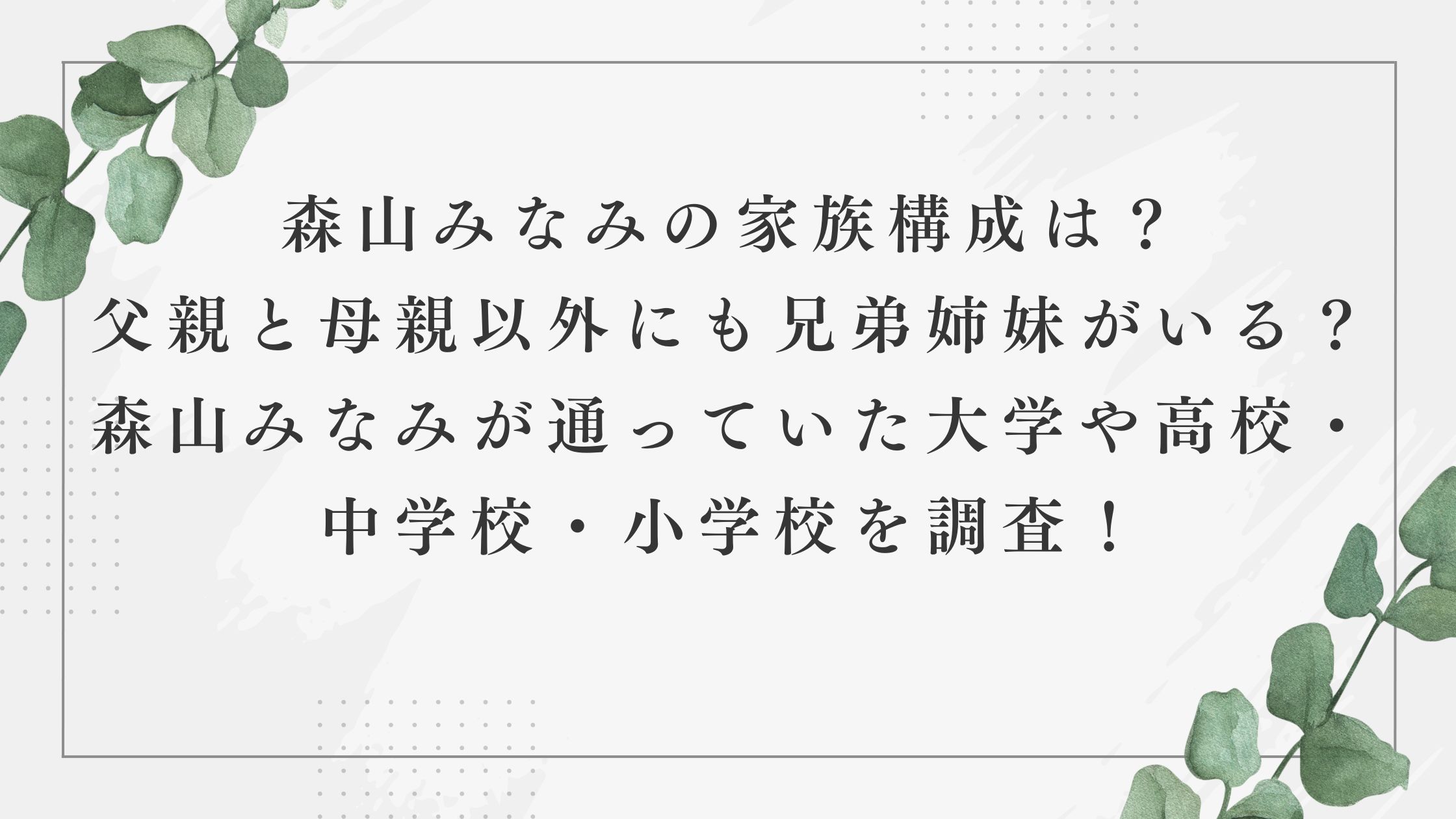 森山みなみの家族構成は?父親と母親以外にも兄弟姉妹がいる?森山みなみが通っていた大学や高校・中学校・小学校を調査!と題して、森山みなみアナの家族構成や通っていた学校などについて紹介してきました。